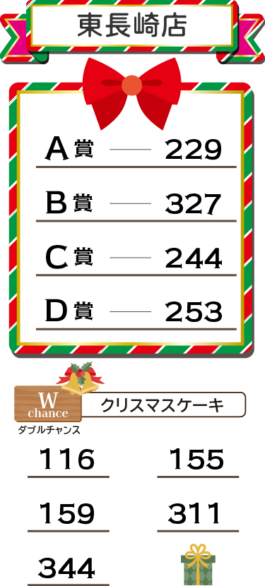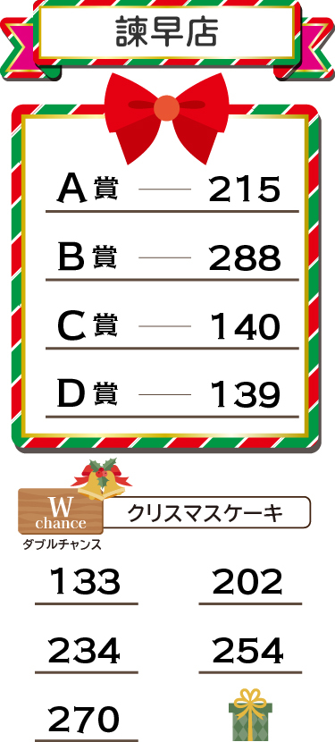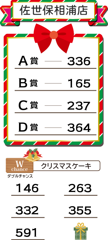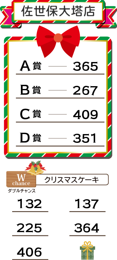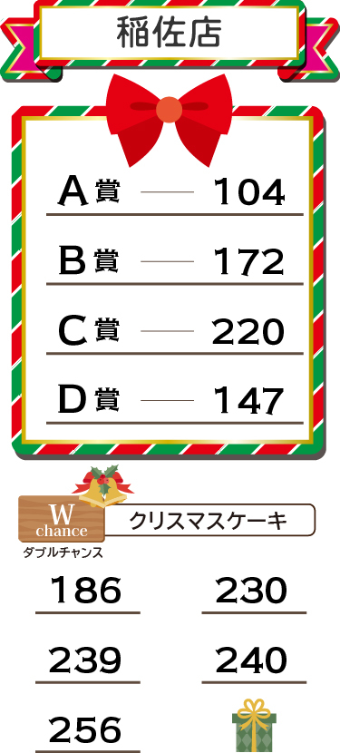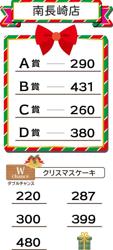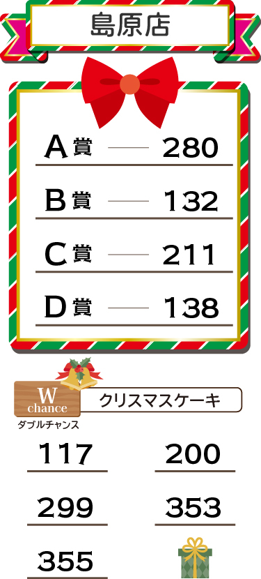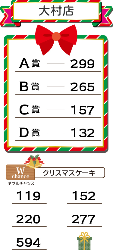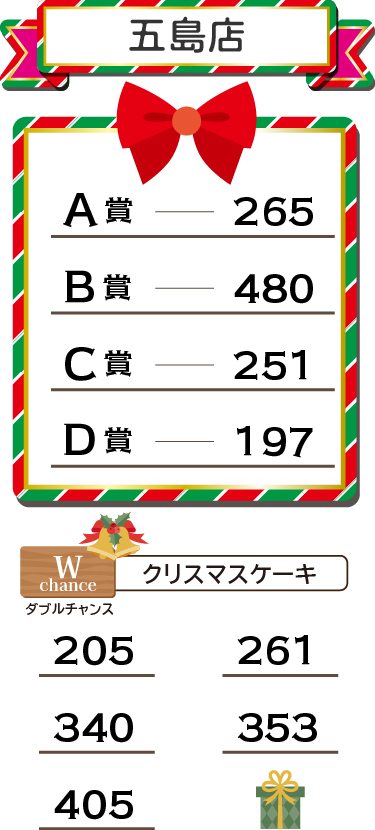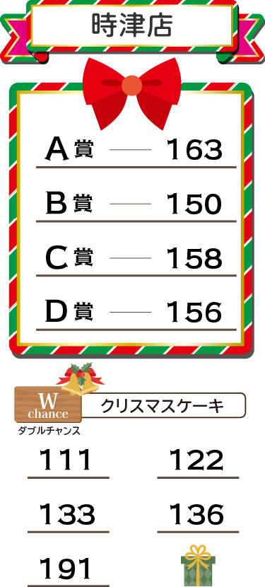 尚、Wチャンス賞のケーキは12/20㈯中に、A賞~D賞のプレゼントのお受け取りは12/27㈯までにお願いします。