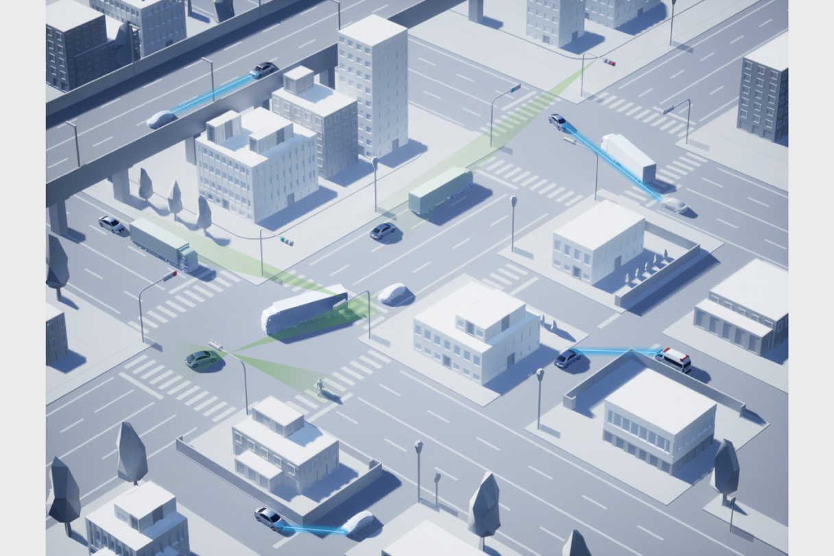 クルマに搭載したセンサーでは捉えきれない見通し外のクルマや人の存在、信号情報を、クルマとクルマ、あるいは道路*2とクルマが直接通信して取得し、マルチインフォメーションディスプレイ表示やブザー音でドライバーに知らせることで安全運転を支援します。